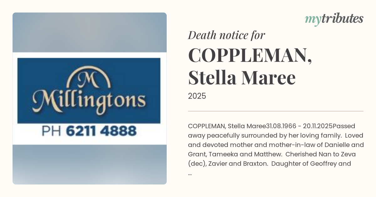 Passed away peacefully surrounded by her loving family. Loved and devoted mother and mother-in-law of Danielle and Grant, Tameeka and Matthew. Cherished Nan to