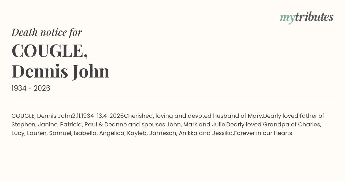 Dearly loved father of Stephen, Janine, Patricia, Paul & Deanne and spouses John, Mark and Julie.