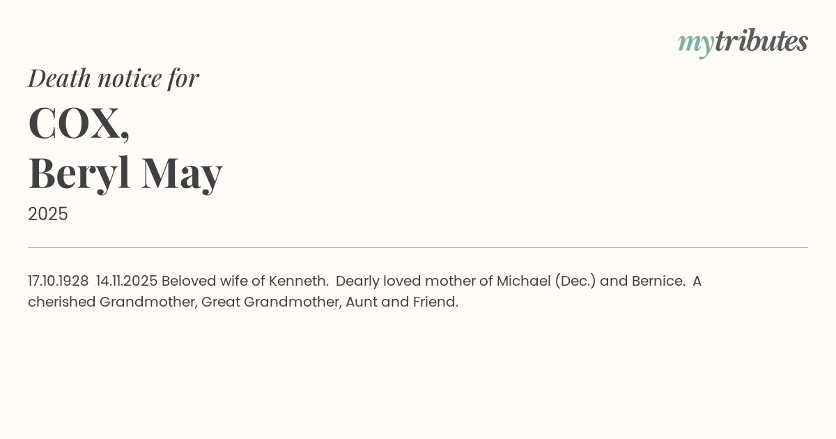 17.10.1928 – 14.11.2025 Beloved wife of Kenneth. Dearly loved mother of Michael (Dec.) and Bernice. A cherished Grandmother, Great Grandmother, Aunt and Friend.
