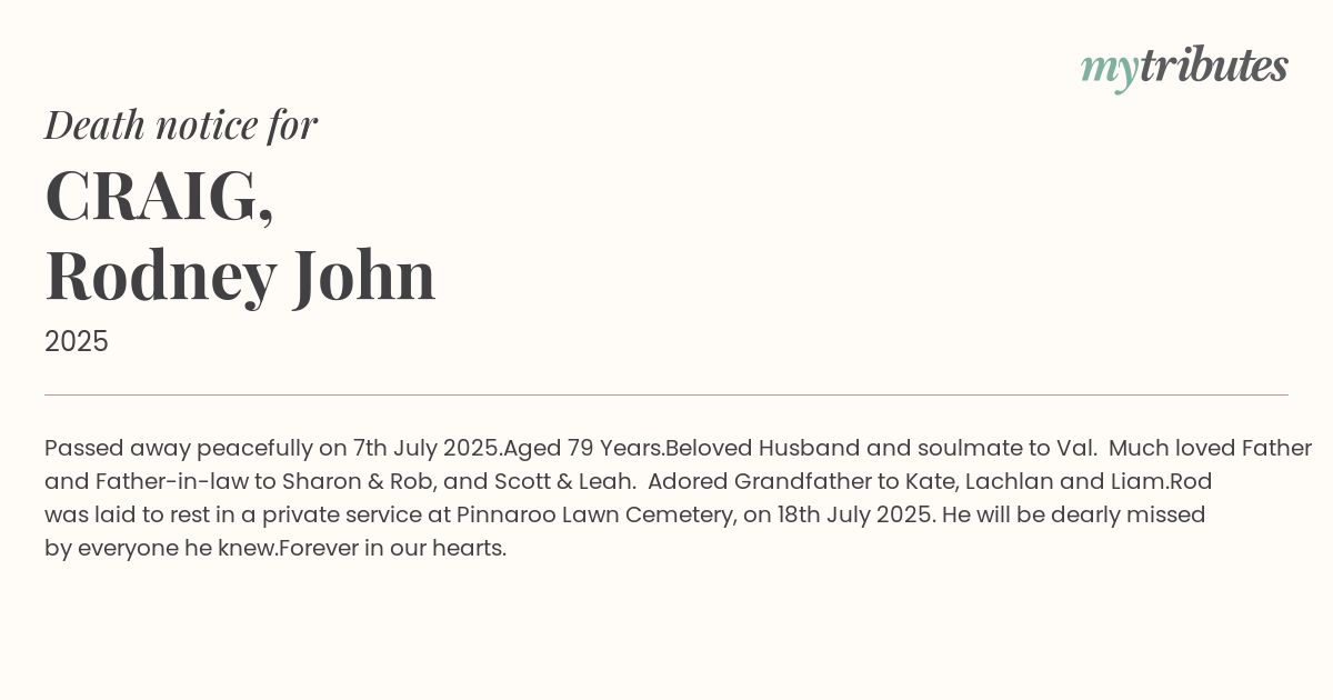 Rod was laid to rest in a private service at Pinnaroo Lawn Cemetery, on 18th July 2025. He will be dearly missed by everyone he knew.