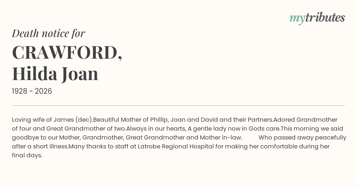 Many thanks to staff at Latrobe Regional Hospital for making her comfortable during her final days.