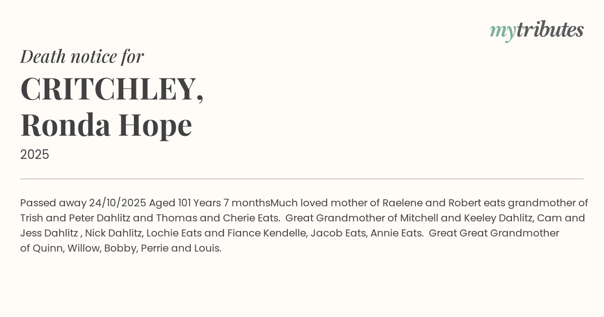 Much loved mother of Raelene and Robert eats grandmother of Trish and Peter Dahlitz and Thomas and Cherie Eats. Great Grandmother of Mitchell and Keeley Dahlitz, Cam and Jess Dahlitz , Nick Dahlitz, Lochie Eats and Fiancée Kendelle, Jacob Eats, Annie Eats. Great Great Grandmother of Quinn, Willow, Bobby, Perrie and Louis.