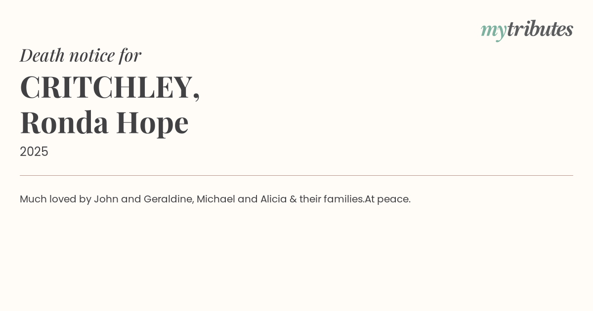 Much loved by John and Geraldine, Michael and Alicia & their families.