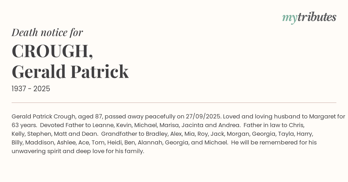 Gerald Patrick Crough, aged 87, passed away peacefully on 27/09/2025.