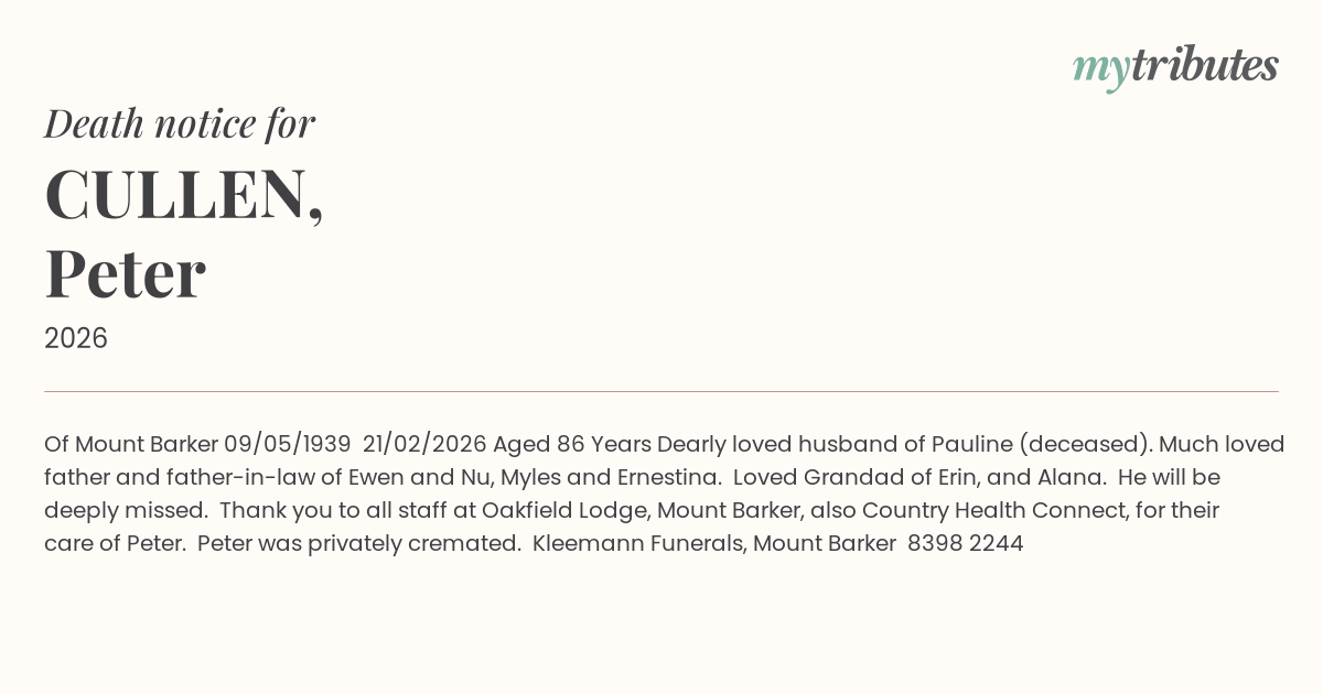 Of Mount Barker 09/05/1939 – 21/02/2026 Aged 86 Years Dearly loved husband of Pauline (deceased). Much loved father and father-in-law of Ewen and Nu, Myles and Ernestina. Loved Grandad of Erin, and Alana. He will be deeply missed. Thank you to all staff at Oakfield Lodge, Mount Barker, also Country Health Connect, for their care of Peter. Peter was privately cremated. Kleemann Funerals, Mount Barker – 8398 2244
