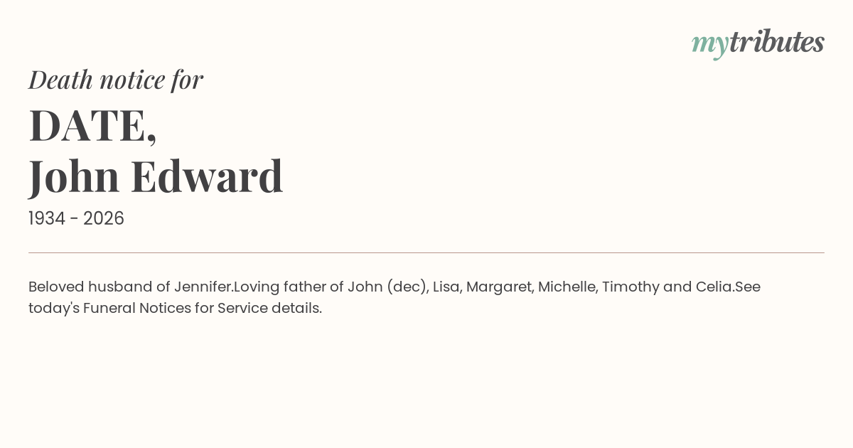 Loving father of John (dec), Lisa, Margaret, Michelle, Timothy and Celia.