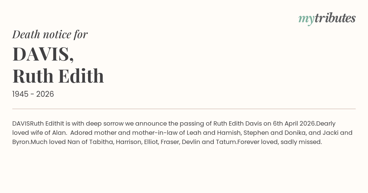 It is with deep sorrow we announce the passing of Ruth Edith Davis on