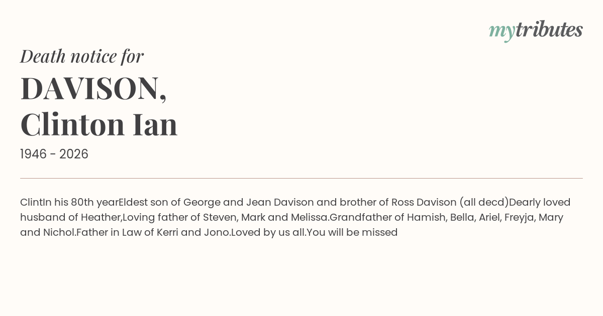 Eldest son of George and Jean Davison and brother of Ross Davison (all dec’d)