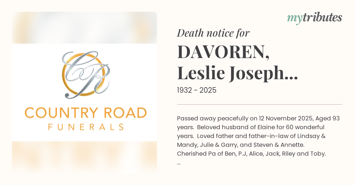 Passed away peacefully on 12 November 2025, Aged 93 years. Beloved husband of Elaine for 60 wonderful years. Loved father and father-in-law of Lindsay & Mandy, Julie & Garry, and Steven & Annette. Cherished Pa of Ben, P.J, Alice, Jack, Riley and Toby. Adored Great-Pa of Amara and Leo, and one precious little one on the way. A true gentleman — deeply loved and forever remembered.