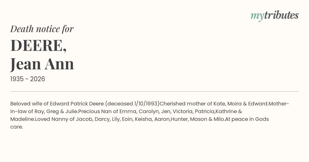 Beloved wife of Edward Patrick Deere (deceased 1/10/1993)