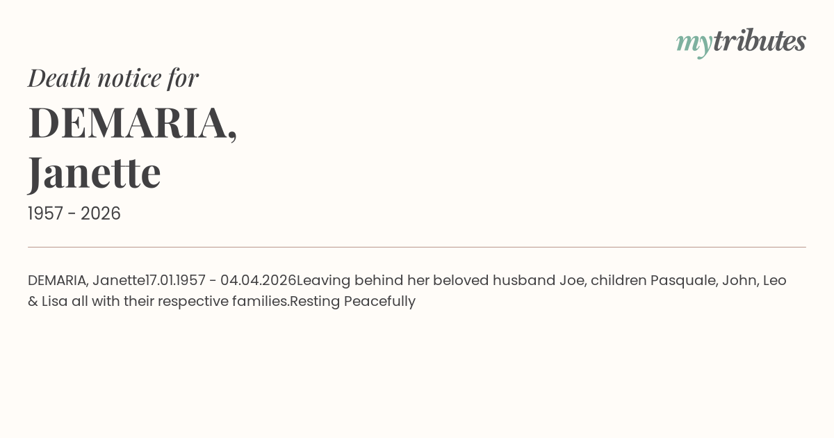 Leaving behind her beloved husband Joe, children Pasquale, John, Leo & Lisa all with their respective families.