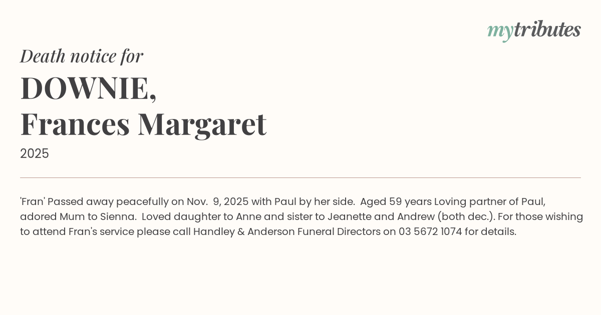 'Fran' Passed away peacefully on Nov. 9, 2025 with Paul by her side. Aged 59 years Loving partner of Paul, adored Mum to Sienna. Loved daughter to Anne and sister to Jeanette and Andrew (both dec.). For those wishing to attend Fran's service please call Handley & Anderson Funeral Directors on 03 567... for details.