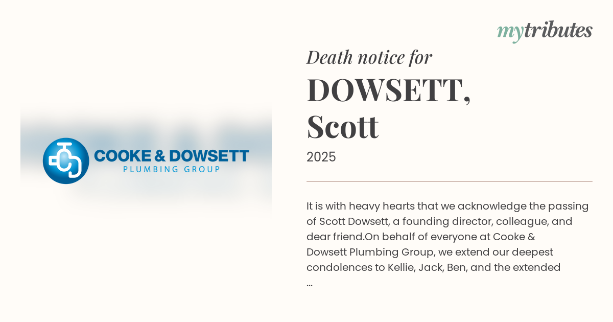 On behalf of everyone at Cooke & Dowsett Plumbing Group, we extend our deepest condolences to Kellie, Jack, Ben, and the extended Dowsett family. Our thoughts and prayers are with you during this incredibly difficult time.