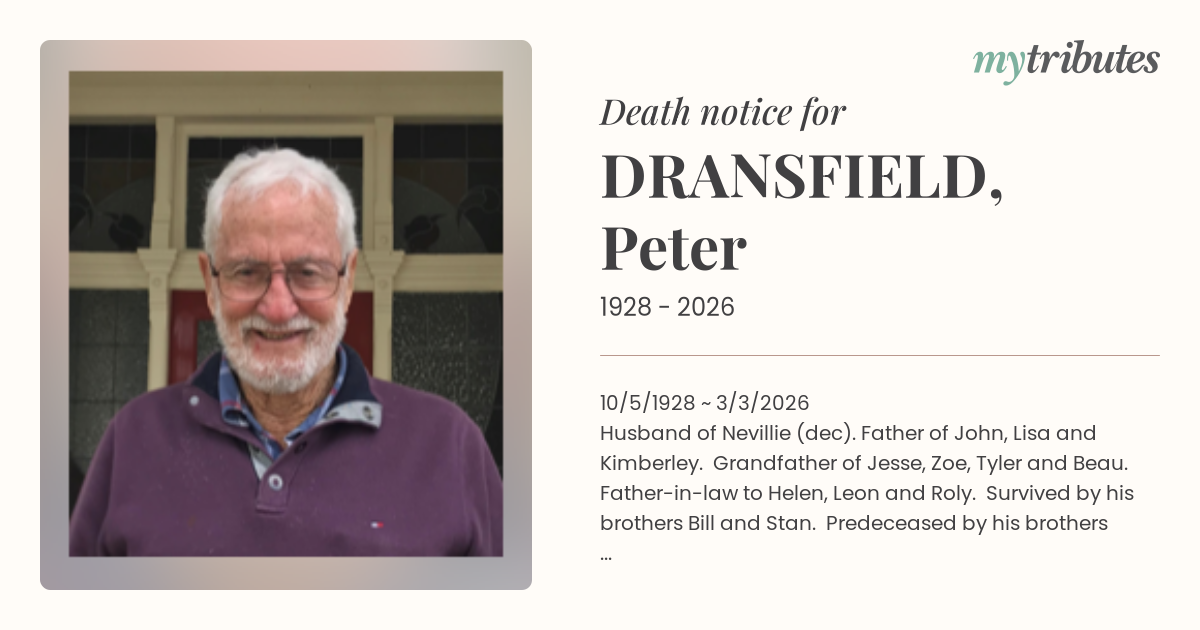 10/5/1928 ~ 3/3/2026 Husband of Nevillie (dec). Father of John, Lisa and Kimberley. Grandfather of Jesse, Zoe, Tyler and Beau. Father-in-law to Helen, Leon and Roly. Survived by his brothers Bill and Stan. Predeceased by his brothers Jack and Alan. Greatly loved by all. May you have fair winds and following seas. Memorial to be held in April.