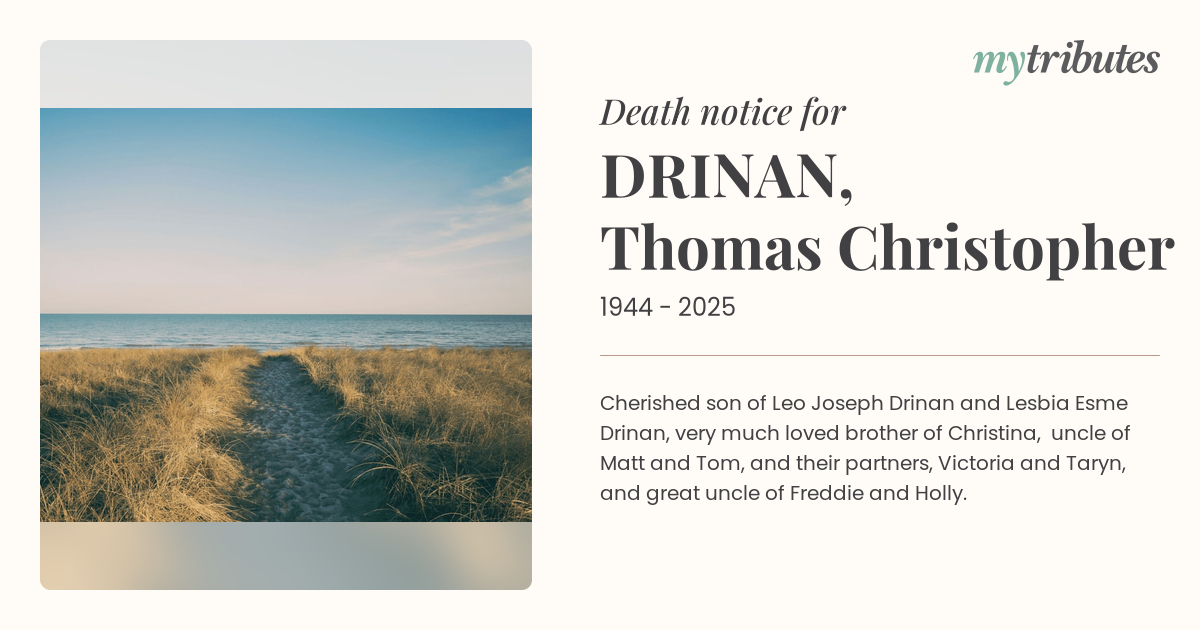 Cherished son of Leo Joseph Drinan and Lesbia Esme Drinan, very much loved brother of Christina, uncle of Matt and Tom, and their partners, Victoria and Taryn, and great uncle of Freddie and Holly.