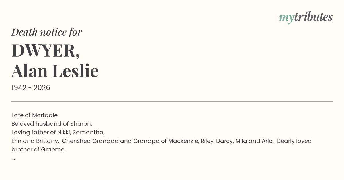 Erin and Brittany. Cherished Grandad and Grandpa of Mackenzie, Riley, Darcy, Mila and Arlo. Dearly loved brother of Graeme.