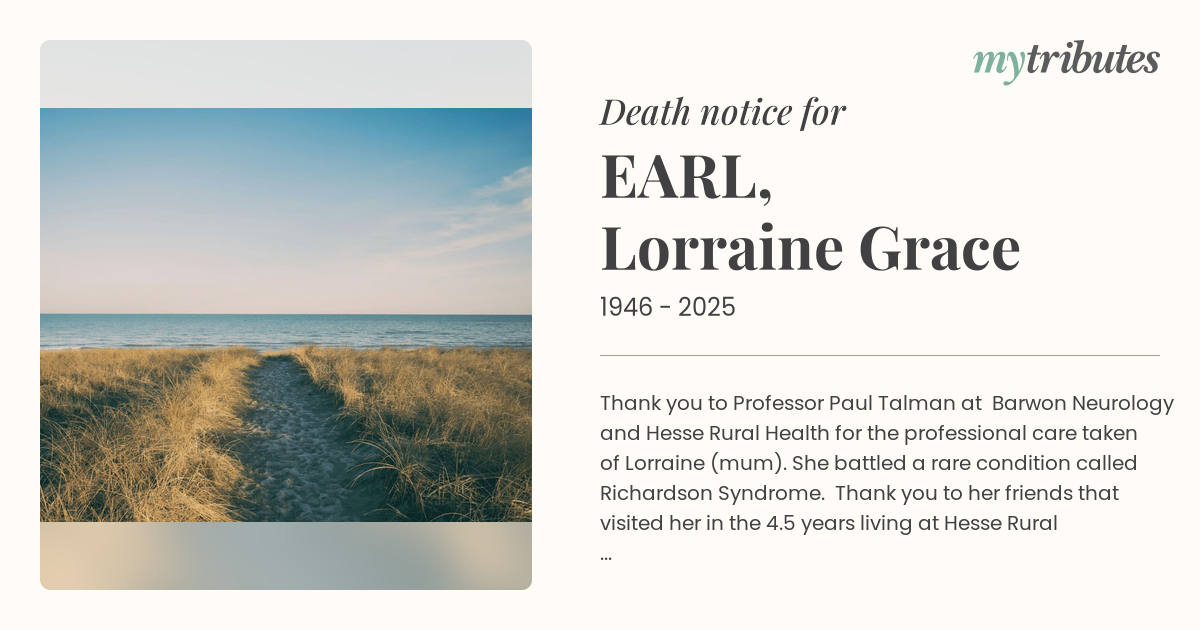 Thank you to Professor Paul Talman at Barwon Neurology and Hesse Rural Health for the professional care taken of Lorraine (mum). She battled a rare condition called Richardson Syndrome. Thank you to her friends that visited her in the 4.5 years living at Hesse Rural Health. She loved your visits. You are now at peace mum and reunited with dad (Nugget). Miss you dearly Sue, Chris, Edwina and Fraser