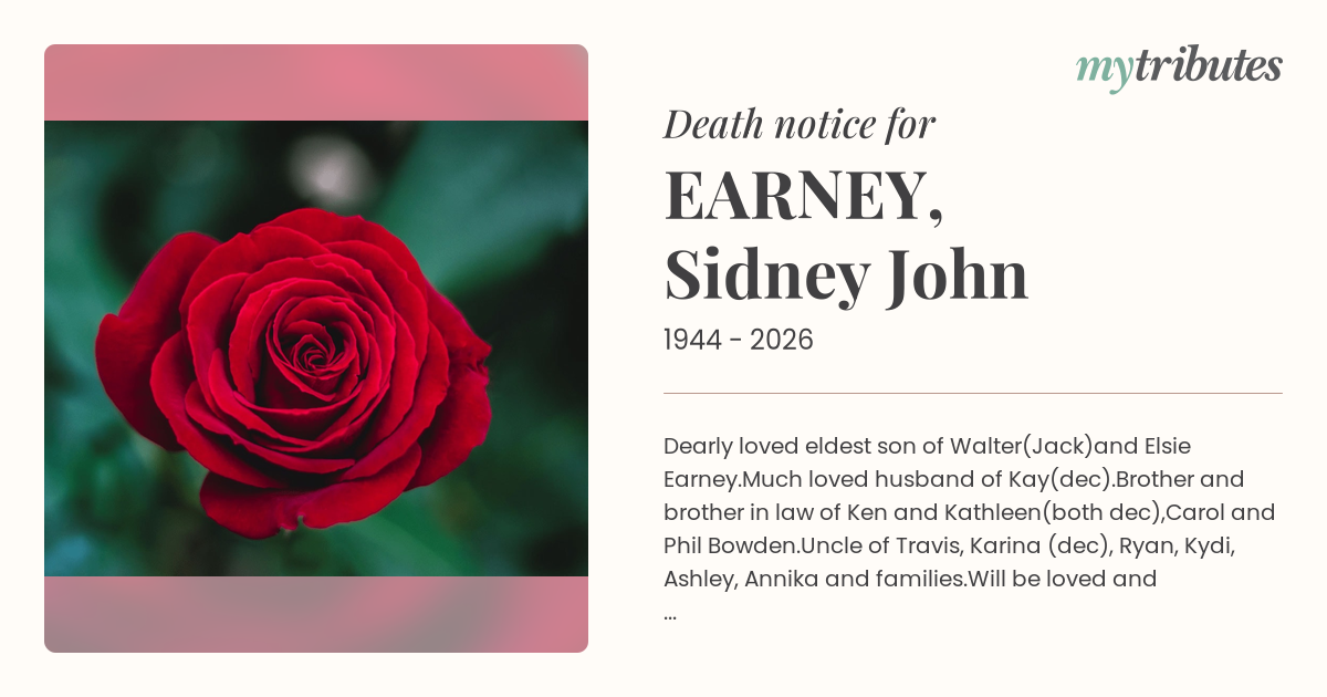 Dearly loved eldest son of Walter(Jack)and Elsie Earney.Much loved husband of Kay(dec).Brother and brother in law of Ken and Kathleen(both dec),Carol and Phil Bowden.Uncle of Travis, Karina (dec), Ryan, Kydi, Ashley, Annika and families.Will be loved and remembered always.