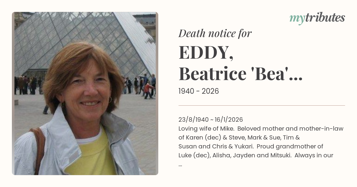 23/8/1940 ~ 16/1/2026 Loving wife of Mike. Beloved mother and mother-in-law of Karen (dec) & Steve, Mark & Sue, Tim & Susan and Chris & Yukari. Proud grandmother of Luke (dec), Alisha, Jayden and Mitsuki. Always in our hearts.
