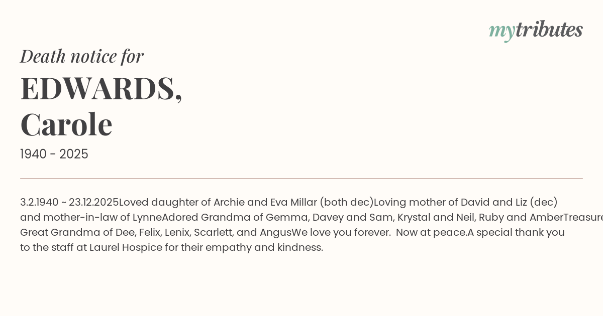 Loved daughter of Archie and Eva Millar (both dec)