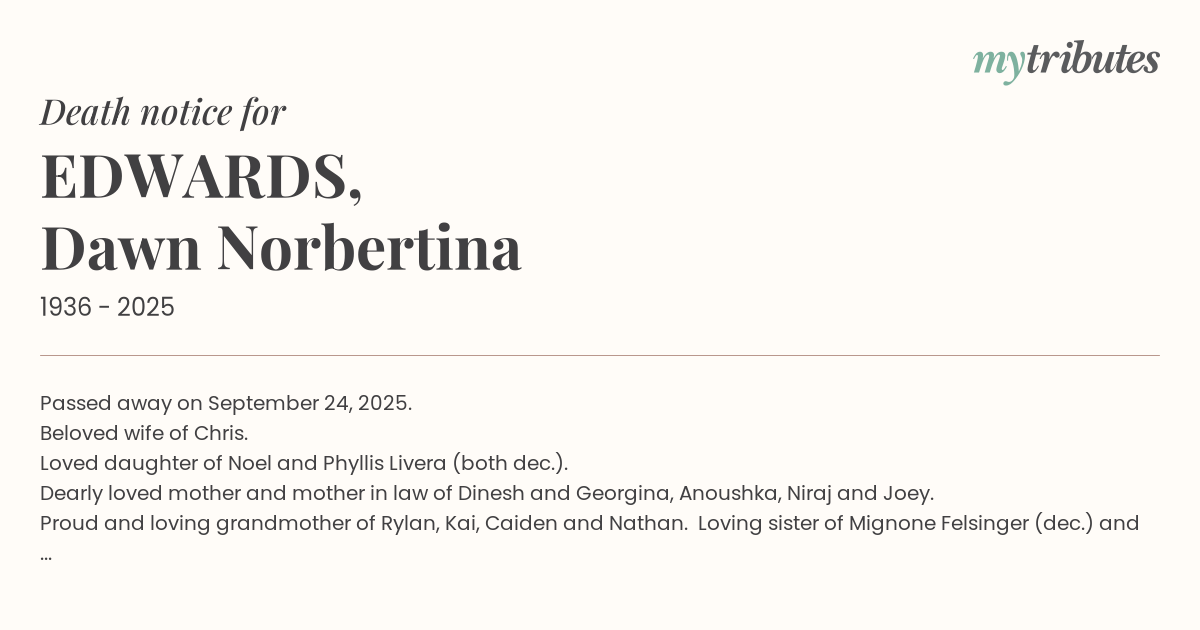 Passed away on September 24, 2025. Beloved wife of Chris. Loved daughter of Noel and Phyllis Livera (both dec.). Dearly loved mother and mother in law of Dinesh and Georgina, Anoushka, Niraj and Joey. Proud and loving grandmother of Rylan, Kai, Caiden and Nathan. Loving sister of Mignone Felsinger (dec.) and Ray Livera. In God's Care