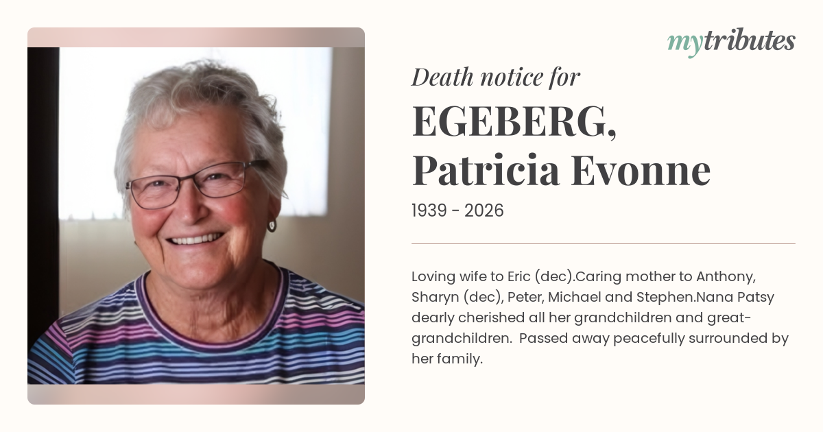 Caring mother to Anthony, Sharyn (dec), Peter, Michael and Stephen.