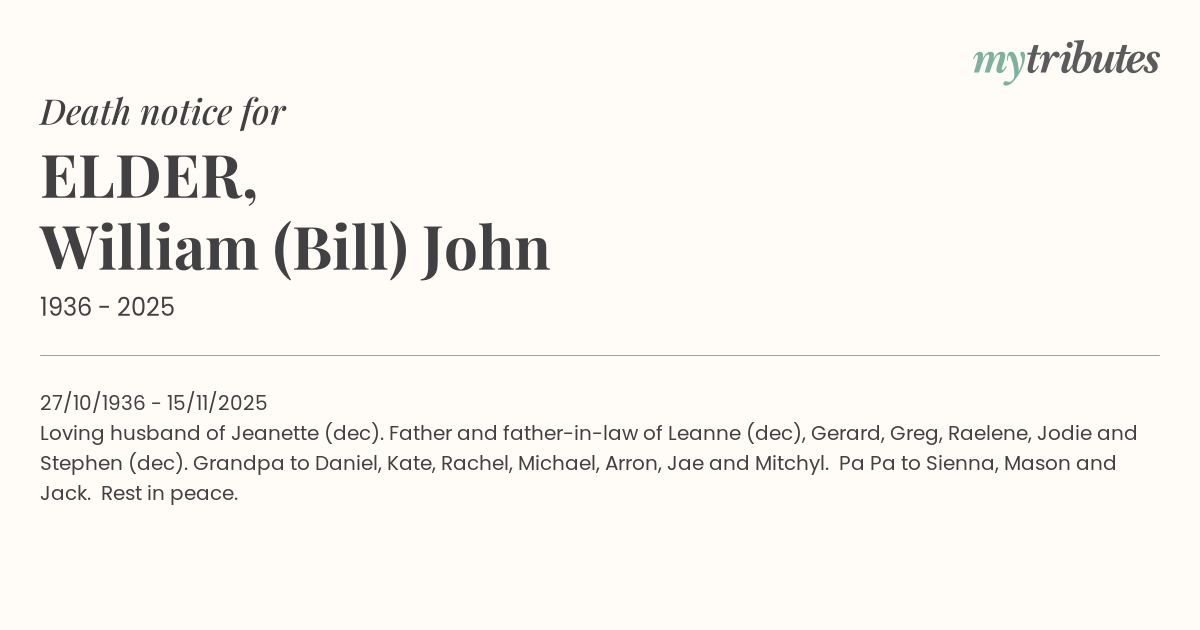 Loving husband of Jeanette (dec). Father and father-in-law of Leanne (dec), Gerard, Greg, Raelene, Jodie and Stephen (dec). Grandpa to Daniel, Kate, Rachel, Michael, Arron, Jae and Mitchyl. Pa Pa to Sienna, Mason and Jack. Rest in peace.
