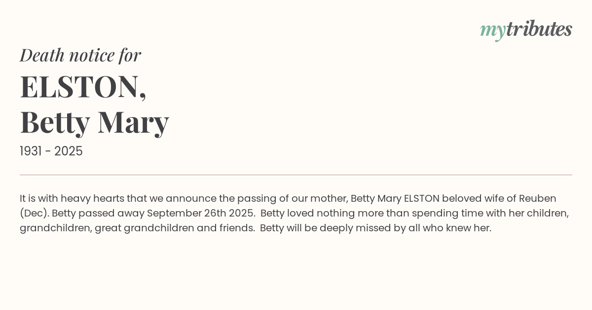 It is with heavy hearts that we announce the passing of our mother, Betty Mary ELSTON beloved wife of Reuben (Dec). Betty passed away September 26th 2025. Betty loved nothing more than spending time with her children, grandchildren, great grandchildren and friends. Betty will be deeply missed by all who knew her.