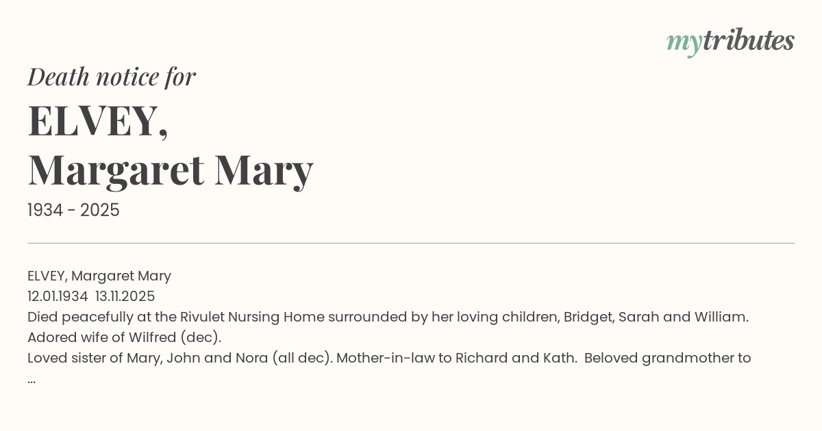 ELVEY, Margaret Mary 12.01.1934 – 13.11.2025 Died peacefully at the Rivulet Nursing Home surrounded by her loving children, Bridget, Sarah and William. Adored wife of Wilfred (dec). Loved sister of Mary, John and Nora (all dec). Mother-in-law to Richard and Kath. Beloved grandmother to Liam, Alec, Stuart, Tilda and Edwin. Cherished Aunt to Linden, Vanessa, Simon, Joanna, Anthony, Shaunagh and Rachel. Our deepest thanks to all the beautiful staff at the Rivulet Nursing Home for providing such wonderful care and company to Margaret for the last 3 years.
