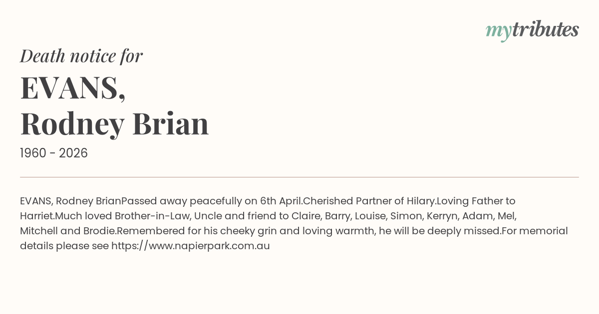 Much loved Brother-in-Law, Uncle and friend to Claire, Barry, Louise, Simon, Kerryn, Adam, Mel, Mitchell and Brodie.