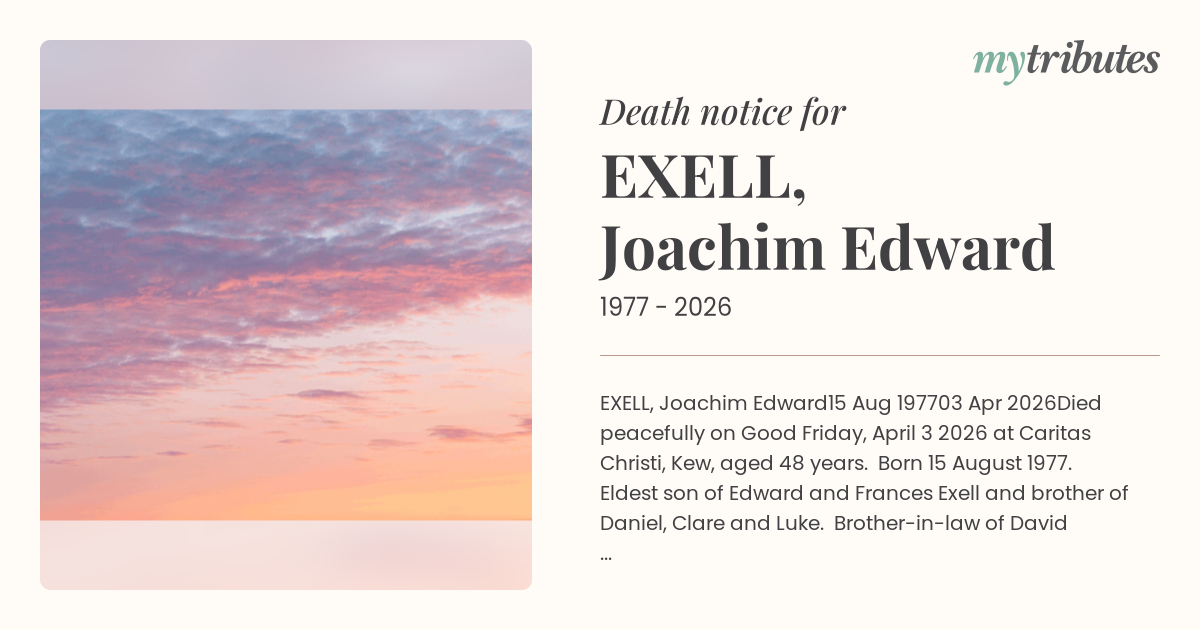 Died peacefully on Good Friday, April 3 2026 at Caritas Christi, Kew, aged 48 years. Born 15 August 1977. Eldest son of Edward and Frances Exell and brother of Daniel, Clare and Luke. Brother-in-law of David Laflin, Adrian Healy and Carla Presbury. Much loved uncle of Mia and Henry Exell, Frederick, Edward and Neave Laflin and Lally Fay. Grandson of Elizabeth Rolfe (dec) and Patricia Exell (dec). Heartfelt thanks to the L’Arche Community who also have walked the journey with Jo. Thanks also to all those wonderful souls who helped make Jo’s life such a joy, including the priests and parishes where Jo lived and worshipped and the many doctors, nurses and health professionals whose skills and compassion were such an important part of the journey. May he rest in the peace of the Risen Lord.