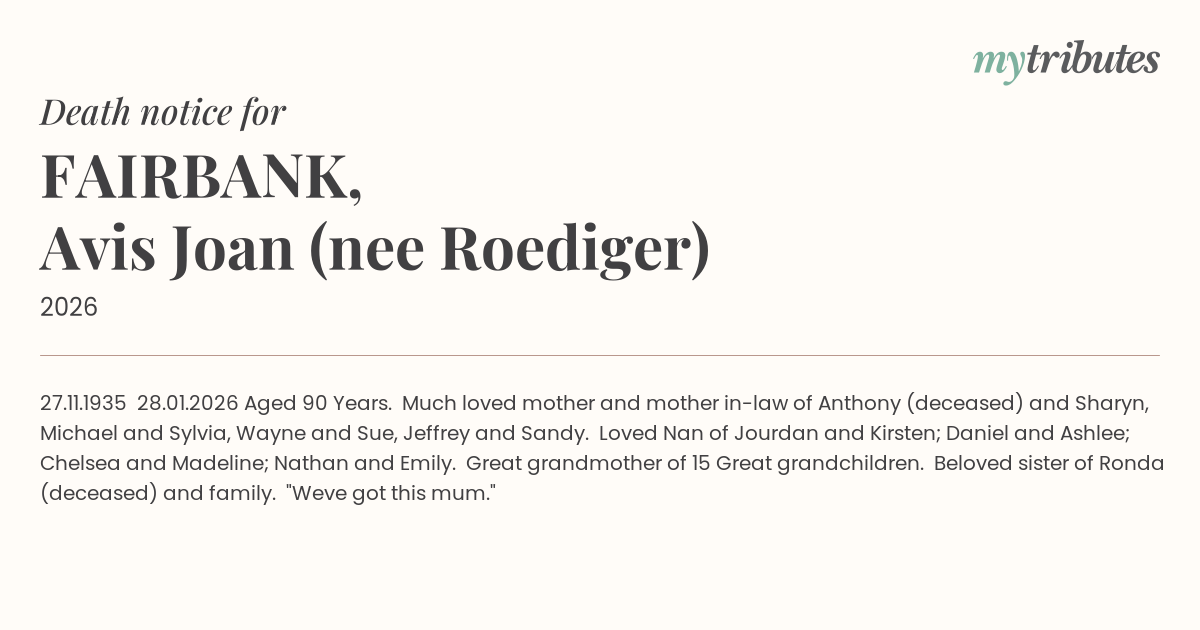 27.11.1935 – 28.01.2026 Aged 90 Years. Much loved mother and mother in-law of Anthony (deceased) and Sharyn, Michael and Sylvia, Wayne and Sue, Jeffrey and Sandy. Loved Nan of Jourdan and Kirsten; Daniel and Ashlee; Chelsea and Madeline; Nathan and Emily. Great grandmother of 15 Great grandchildren. Beloved sister of Ronda (deceased) and family. "We’ve got this mum."