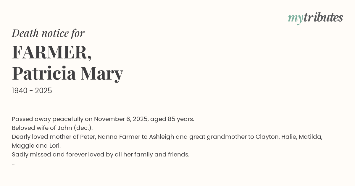 Dearly loved mother of Peter, Nanna Farmer to Ashleigh and great grandmother to Clayton, Halie, Matilda, Maggie and Lori.