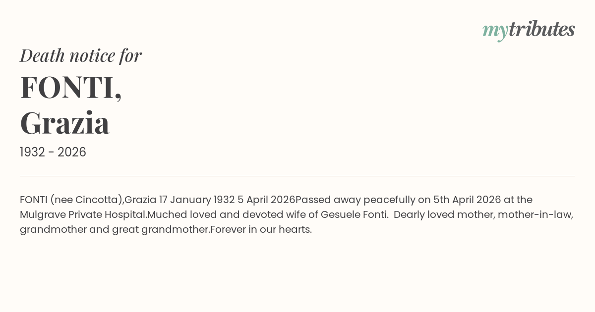 Muched loved and devoted wife of Gesuele Fonti. Dearly loved mother, mother-in-law, grandmother and great grandmother.