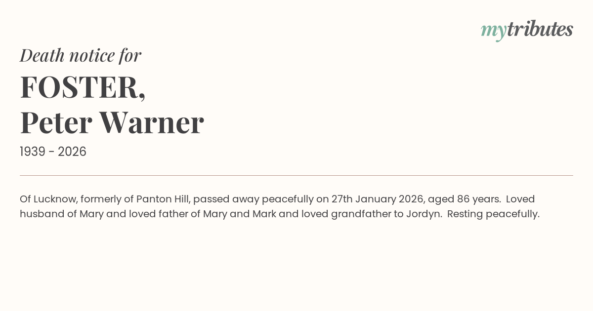 Of Lucknow, formerly of Panton Hill, passed away peacefully on 27th January 2026, aged 86 years. Loved husband of Mary and loved father of Mary and Mark and loved grandfather to Jordyn. Resting peacefully.