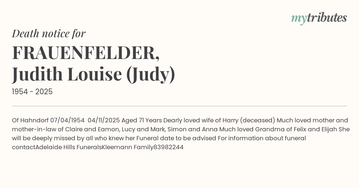 Of Hahndorf 07/04/1954 – 04/11/2025 Aged 71 Years Dearly loved wife of Harry (deceased) Much loved mother and mother-in-law of Claire and Eamon, Lucy and Mark, Simon and Anna Much loved Grandma of Felix and Elijah She will be deeply missed by all who knew her Funeral date to be advised For information about funeral contact