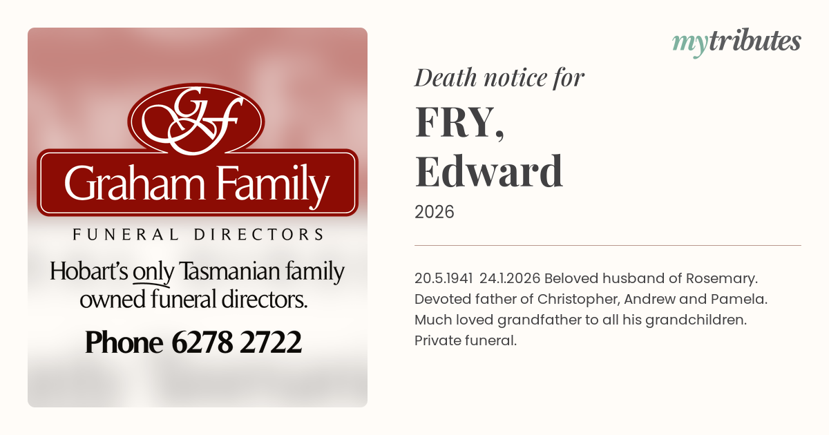 20.5.1941 – 24.1.2026 Beloved husband of Rosemary. Devoted father of Christopher, Andrew and Pamela. Much loved grandfather to all his grandchildren. Private funeral.