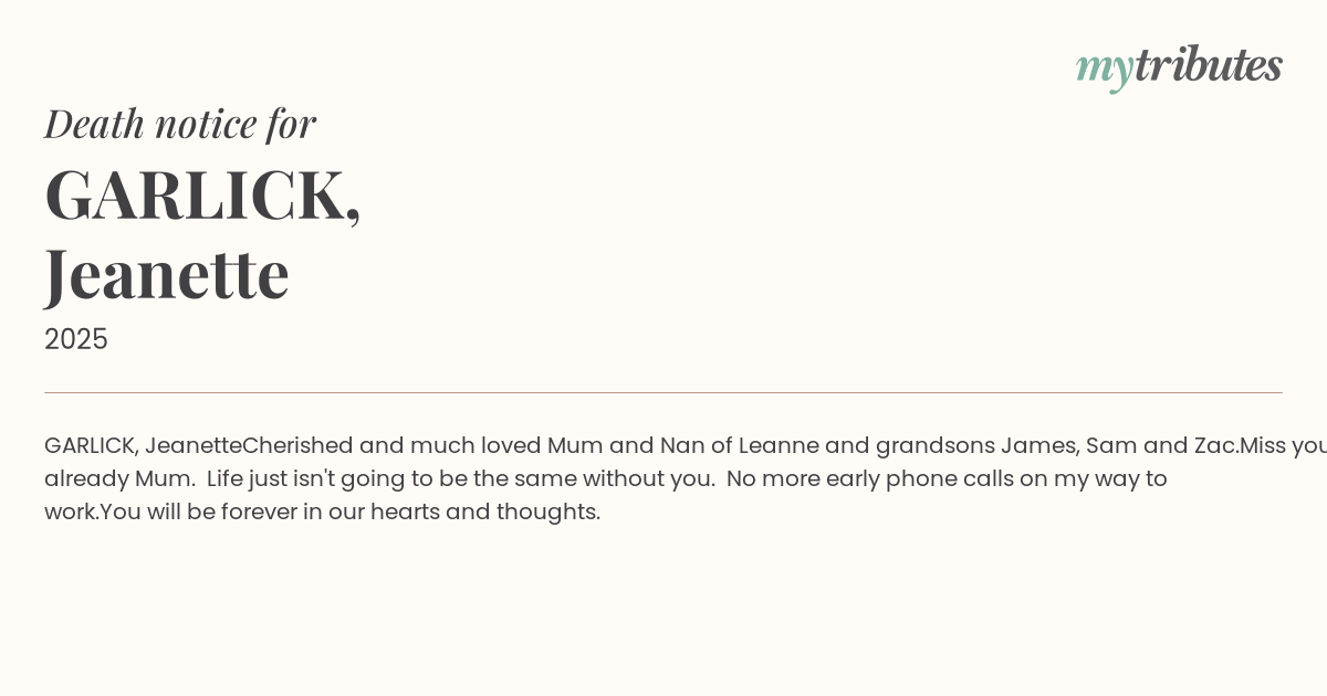 Cherished and much loved Mum and Nan of Leanne and grandsons James, Sam and Zac.