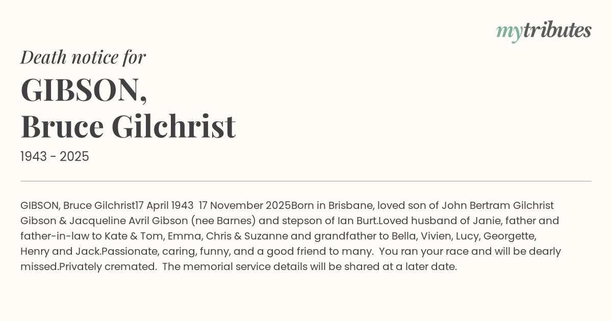 Born in Brisbane, loved son of John Bertram Gilchrist Gibson & Jacqueline Avril Gibson (nee Barnes) and stepson of Ian Burt.