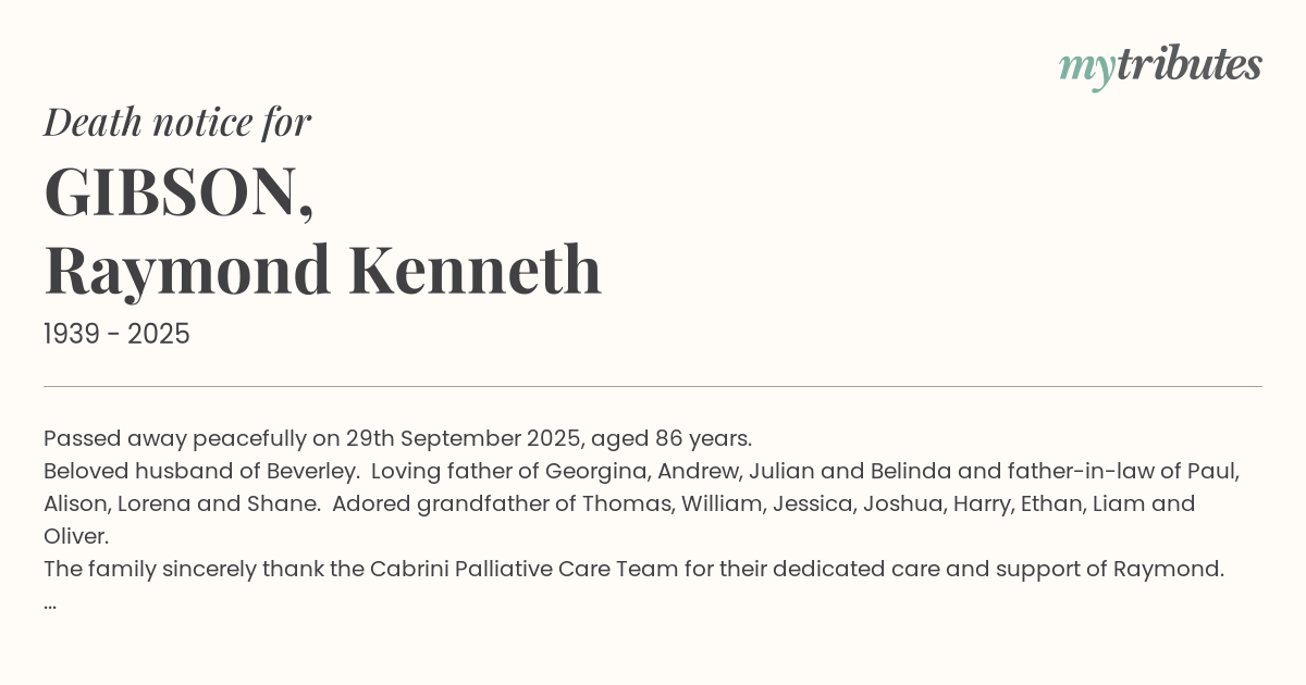 The family sincerely thank the Cabrini Palliative Care Team for their dedicated care and support of Raymond.