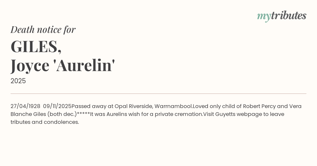 Loved only child of Robert Percy and Vera Blanche Giles (both dec.)
