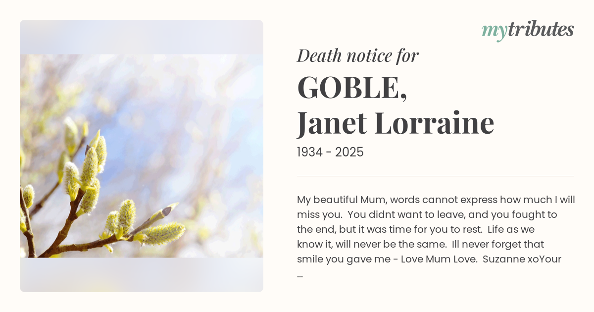 My beautiful Mum, words cannot express how much I will miss you. You didn’t want to leave, and you fought to the end, but it was time for you to rest. Life as we know it, will never be the same. I’ll never forget that smile you gave me - ‘Love Mum… Love.’ Suzanne xo