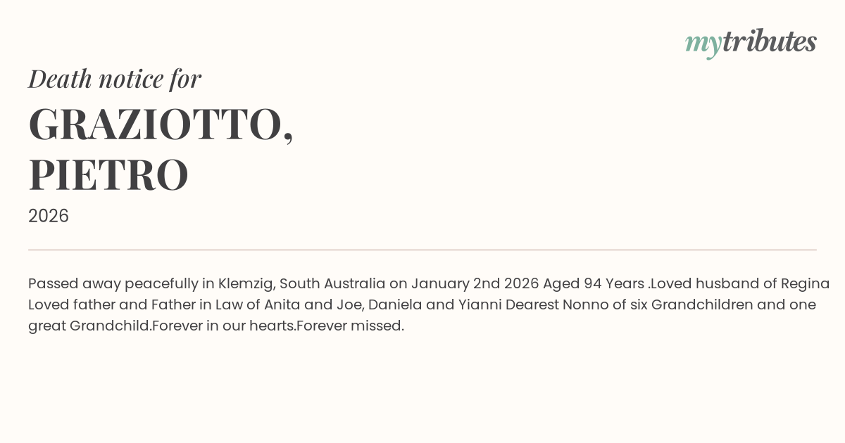 Passed away peacefully in Klemzig, South Australia on January 2nd 2026 Aged 94 Years .Loved husband of Regina