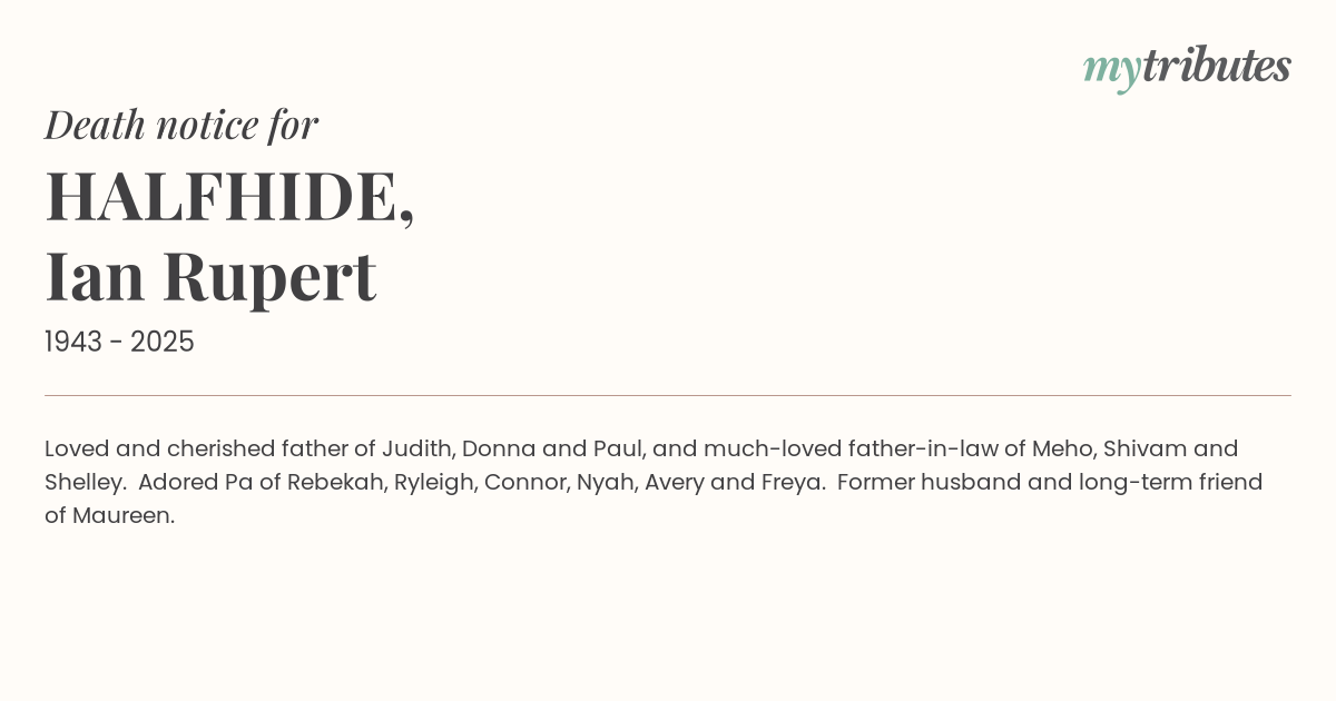 Loved and cherished father of Judith, Donna and Paul, and much-loved father-in-law of Meho, Shivam and Shelley. Adored Pa of Rebekah, Ryleigh, Connor, Nyah, Avery and Freya. Former husband and long-term friend of Maureen.