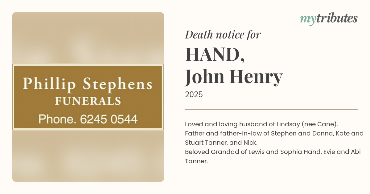 Father and father-in-law of Stephen and Donna, Kate and Stuart Tanner, and Nick.