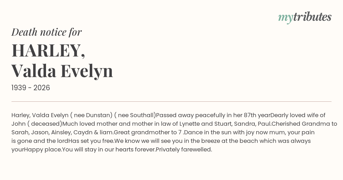 Harley, Valda Evelyn ( nee Dunstan) ( nee Southall)