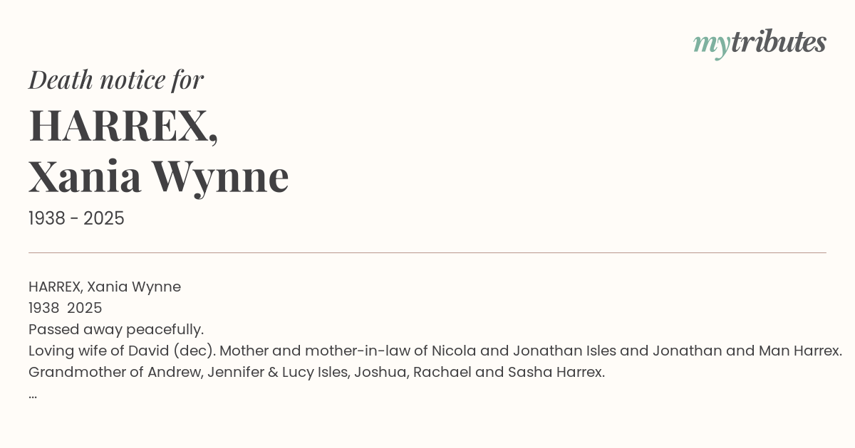 HARREX, Xania Wynne 1938 – 2025 Passed away peacefully. Loving wife of David (dec). Mother and mother-in-law of Nicola and Jonathan Isles and Jonathan and Man Harrex. Grandmother of Andrew, Jennifer & Lucy Isles, Joshua, Rachael and Sasha Harrex. Private Cremation.
