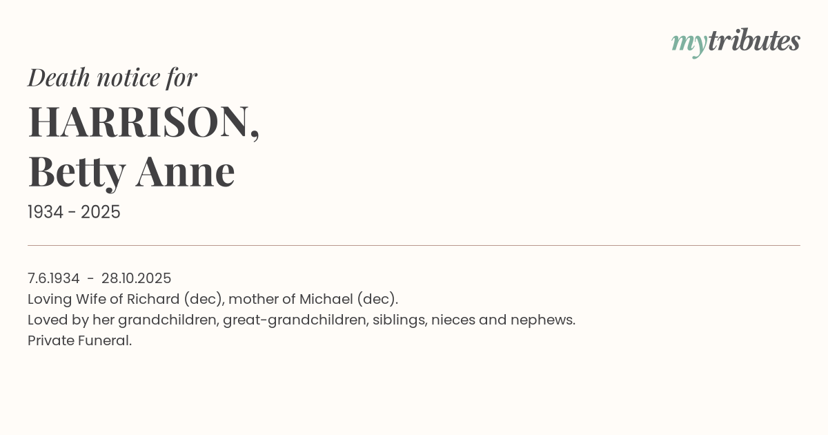 Loving Wife of Richard (dec), mother of Michael (dec).