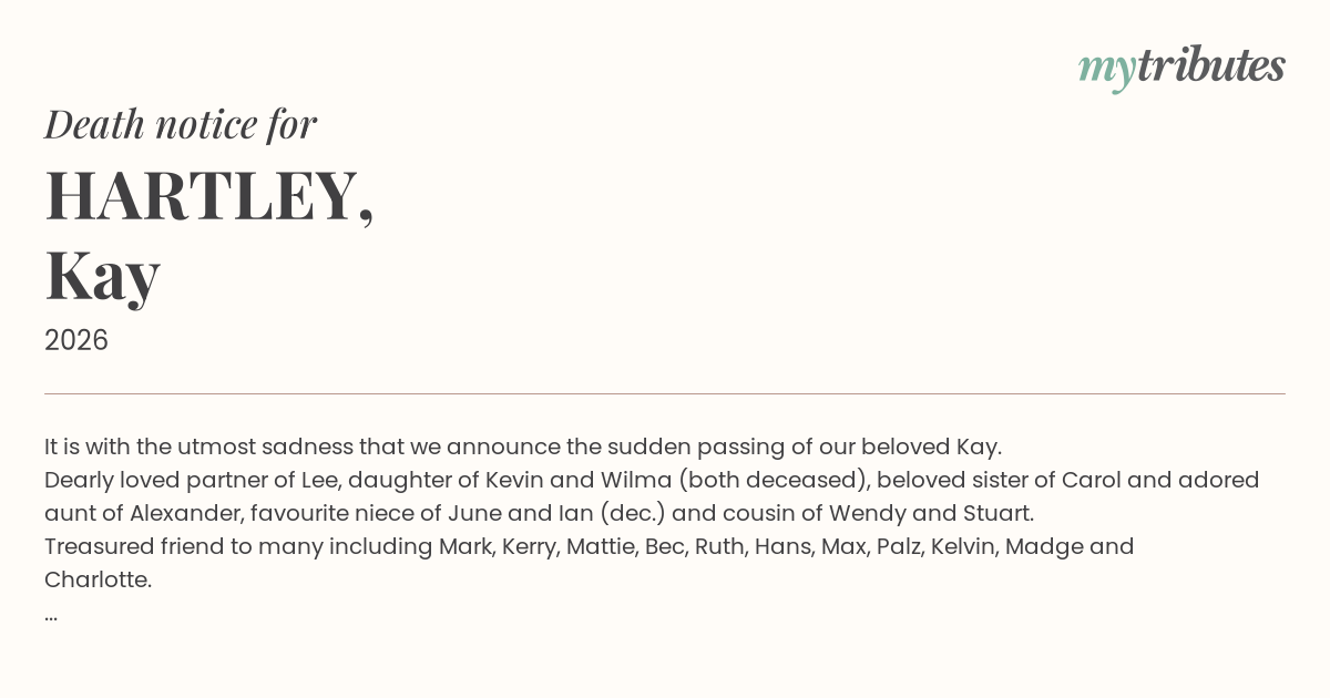 It is with the utmost sadness that we announce the sudden passing of our beloved Kay.