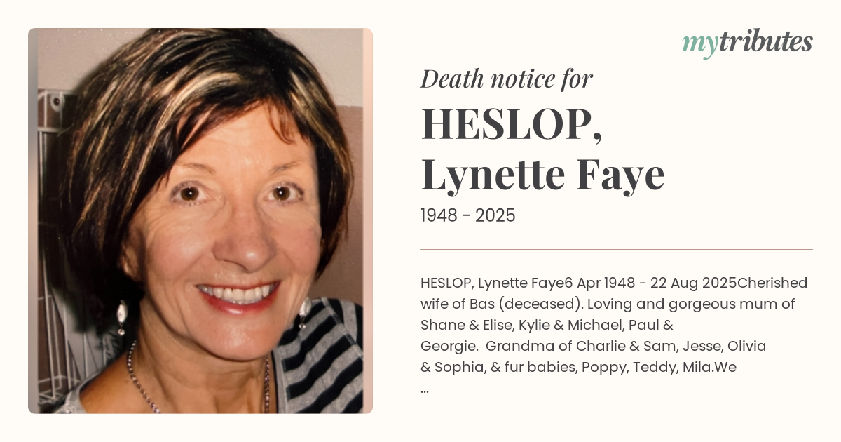 Cherished wife of Bas (deceased). Loving and gorgeous mum of Shane & Elise, Kylie & Michael,